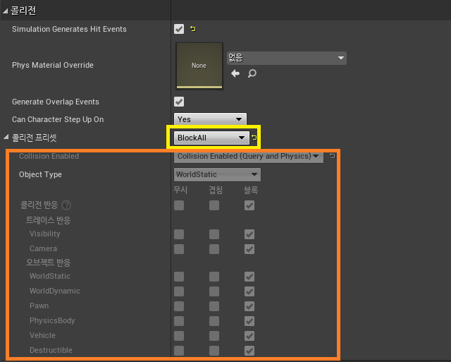 아래 주황색 박스 부분은 콜리전 프리셋에 대한 세부 옵션이다. 각 콜리전 프리셋마다 세부 옵션은 정해져 있지만, Custom 을 선택할 경우 세부 옵션을 원하는 대로 설정할 수도 있다.