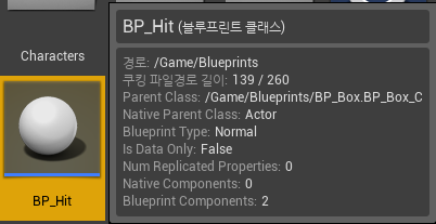 > [BP_Box] 우클릭 - [자손 블루프린트 클래스 생성] 선택 (이름 : BP_Hit)
