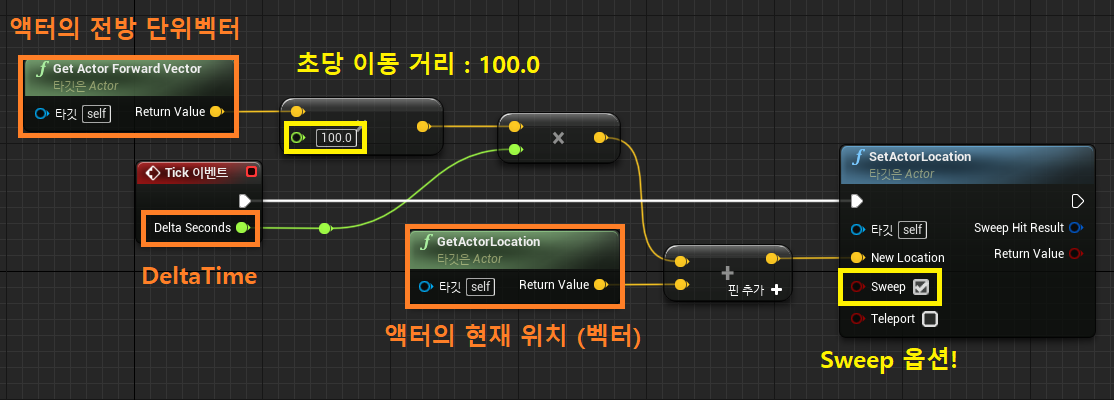 액터의 전방 단위벡터에 100.0, DeltaTime을 곱하여 현재 위치에 더한다. 이것으로 현재 위치에서 앞쪽으로, 초당 100만큼 떨어진 곳에 매 순간 위치하게 된다. Sweep 옵션을 켜주면 현재 위치와 다음에 위치할 곳 사이에서 발생할 충돌을 감지해 준다.